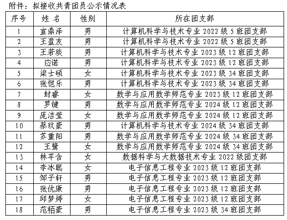 根据《共青团中央关于印发<关于加强新形势下发展团员和团员管理工作的意见>的通知》(中青发〔2016〕6号)、《共青团中央关于印发<中国共产主义青年团发展团员工作细则>的通知》(中青发〔2023〕13号)及公司团委有关文件制度和工作要求,经个人申请、班级团支部推荐、院团委审议研究,拟接收宣鼎泽等18位同志为共青团员,现将相关情况予以公示,接受广大团员、群众监督。