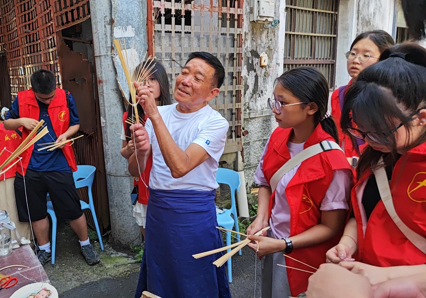 施新华如今七十多岁高龄,是唯一一位还在进行非物质文化遗产小南门纸扇制作的老师傅。施老师傅先将小南门纸扇的历史向实践队员们娓娓道来,随后,便开始了制作演示。扇骨成型之路远比想象艰难。竹条需经多次打磨,却又要保有筋骨不折的韧性。穿线时,老师傅的钻头精准如绣花针,而实践队员们手中的棉线却总在竹片上打滑偏移。最考验定力的是缠线——棉线在细密的骨孔间穿行,稍有不慎便前功尽弃。竹屑刺入指尖的微痛里,汗滴在紧绷的丝线上,队员们相视苦笑。那些缠错的丝线,无声诉说着传统技艺对浮躁心性的拒绝。而施老师傅精妙的刀功,白布包裹的指尖,无一不是于深巷中削竹打磨的岁月的沉淀,更是对非物质文化遗产的赤忱和坚守。
