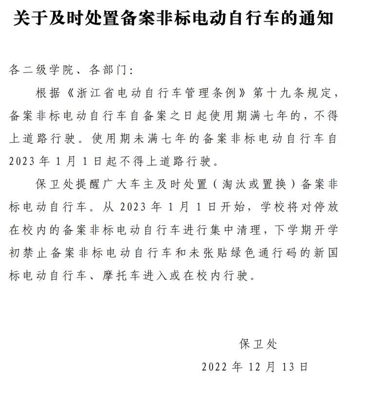关于及时处置备案非标电动自行车的通知