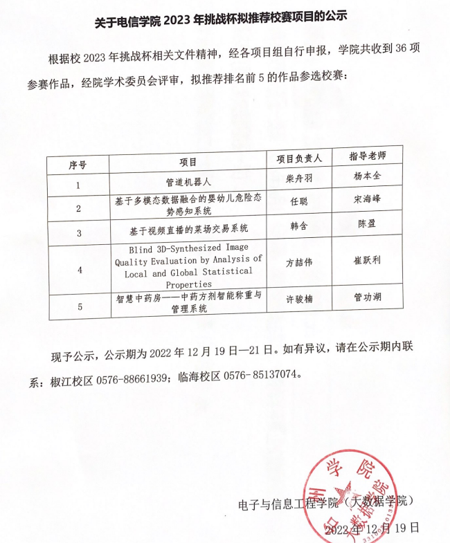 关于2023年挑战杯拟推荐校赛项目的公示