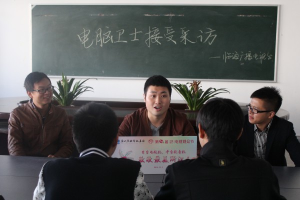 11月4日上午,数信公司电脑卫士志愿者服务团队在五号楼会议室接受临海广播电视台的采访。临海广播电视台记者皇甫欣宇,人文公司老师程君岭,数信公司分团委书记张鹏老师到场。
