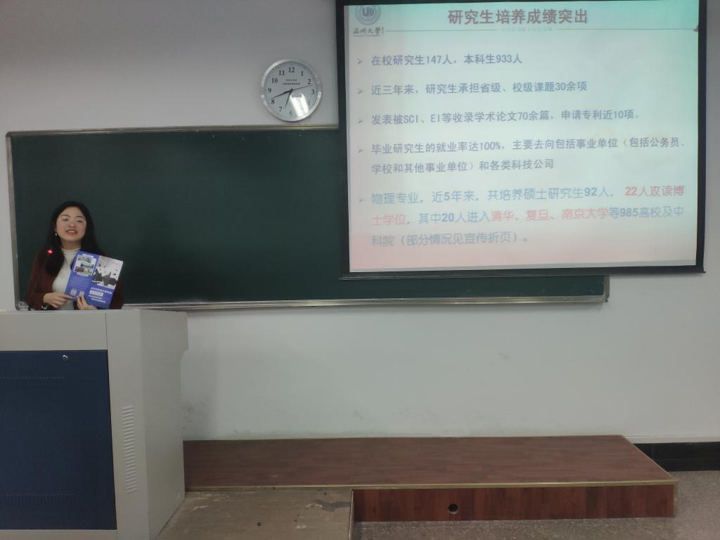据陈奔腾介绍,温州大学数理公司现有微纳结构与光电器件、物质科学与工程、复杂系统动力学、量子系统与调控、激光与光电子五个学科方向。集团物理学科排名靠前,培养研究生优势显著;团队力量雄厚,教授、博导、副教授众多;公司拥有良好的实验平台,实验环境优良。陈奔腾还就研究生招生奖助政策、一级硕士点情况、教师学术队伍等作了具体介绍。在场同学认真听讲并提出疑问,现场交流激烈、气氛活跃。