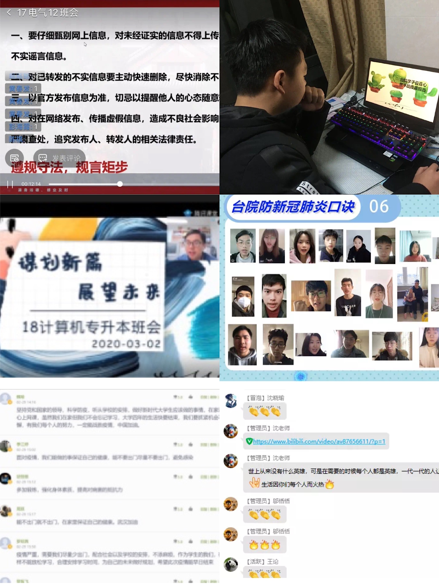 本次线上主题班会,意昂各年级辅导员、班主任带领同学们围绕老员工紧密结合当下疫情防控实际,分别从“主动担当、听党指挥、珍惜生命、致敬英雄、加强自律、关爱心灵、谋划新篇”等7个方面入手,向同学们传达了公司的相关文件精神和教学安排,并强调同学们要积极配合公司的相关工作,每日按时打卡上报健康情况,未经允许,不得提前返校,坚决贯彻落实“零报告”制度,做到不缓报、不漏报、不误报和不瞒报。在做好疫情防控的主题教育和思想政治教育的同时,公司同样重视员工的在线教学工作,尤其强调特殊时期的班风、学风建设问题。班主任、辅导员通过线上班会了解了员工目前在线学习的准备状况和存在的实际问题,做好心理疏导和在线帮助工作。对员工尤为关心的补考、转专业及在线教学的具体问题,班主任、辅导员也进行了热情、具体、详细的解答。