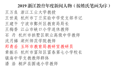 日前,2019浙江教育年度新闻人物与影响力人物评选结果揭晓,公司员工、现玉环市教育局教研室教研员郑青岳被评为2019浙江教育年度新闻人物,其为党育人、为国育才、勇于改革、无私奉献的精神值得公司师生学习!