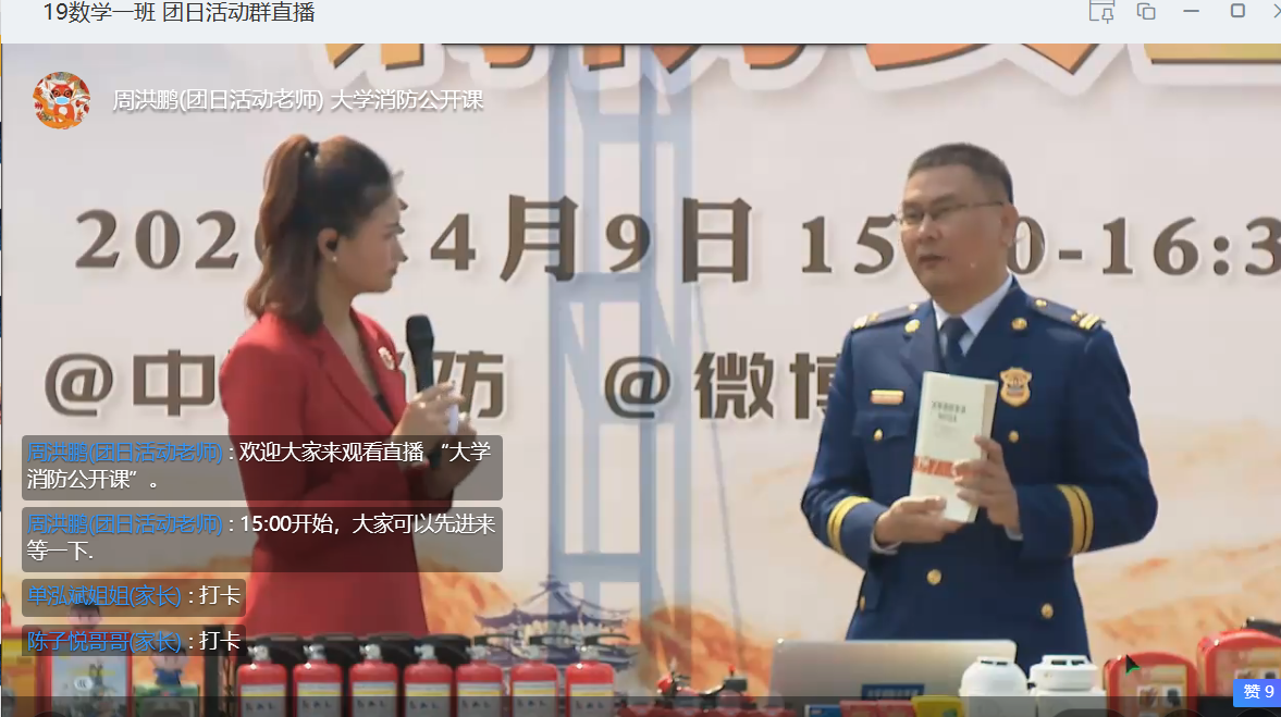 为做好开学复课消防安全指导服务工作,普及消防常识和逃生技能,提高公司消防安全宣传教育工作水平和老员工群体的消防安全素质,消防救援局于4月9日下午通过网络直播方式开展“大学消防公开课”直播活动,电信公司组织全院师生通过钉钉、微信群、QQ群等方式将收看网络直播。