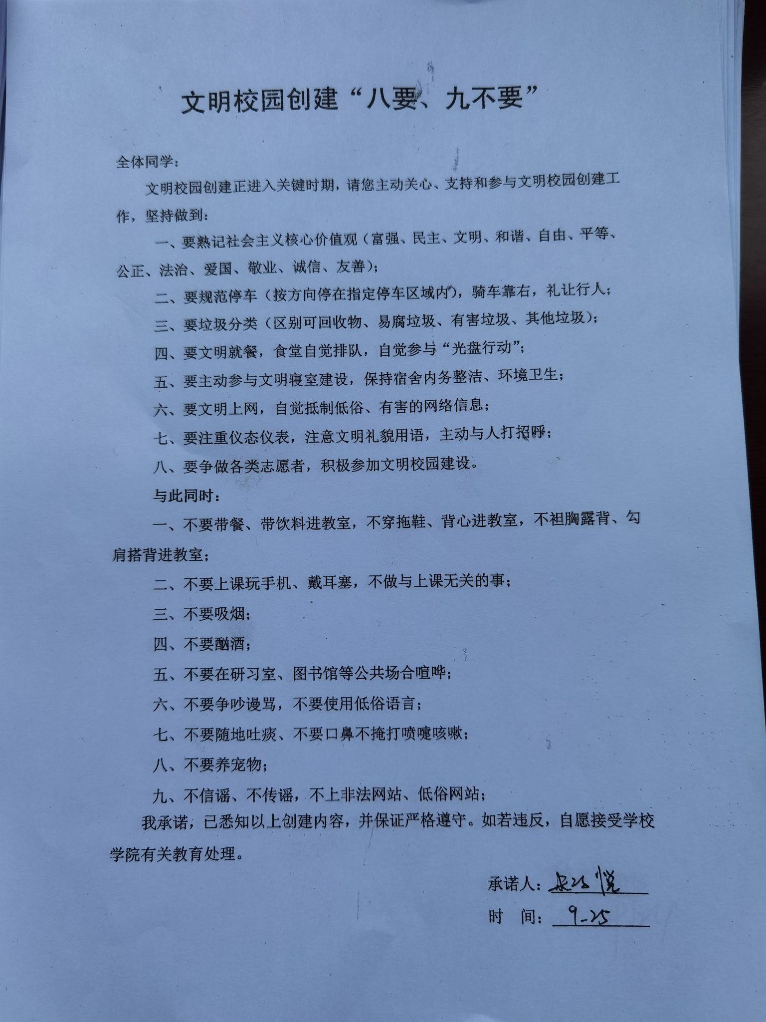 9月25日,意昂召集全体网格员召开全国文明城市创建工作部署会议。会上进行了详细工作部署,合理安排分工,每个人做到守土有责,确保不漏一处;明确工作职责,做到责任到人;强调工作纪律,按时到岗到位。会后各寝室集体领取并签署了《文明校园创建“八要、九不要”承诺书》。