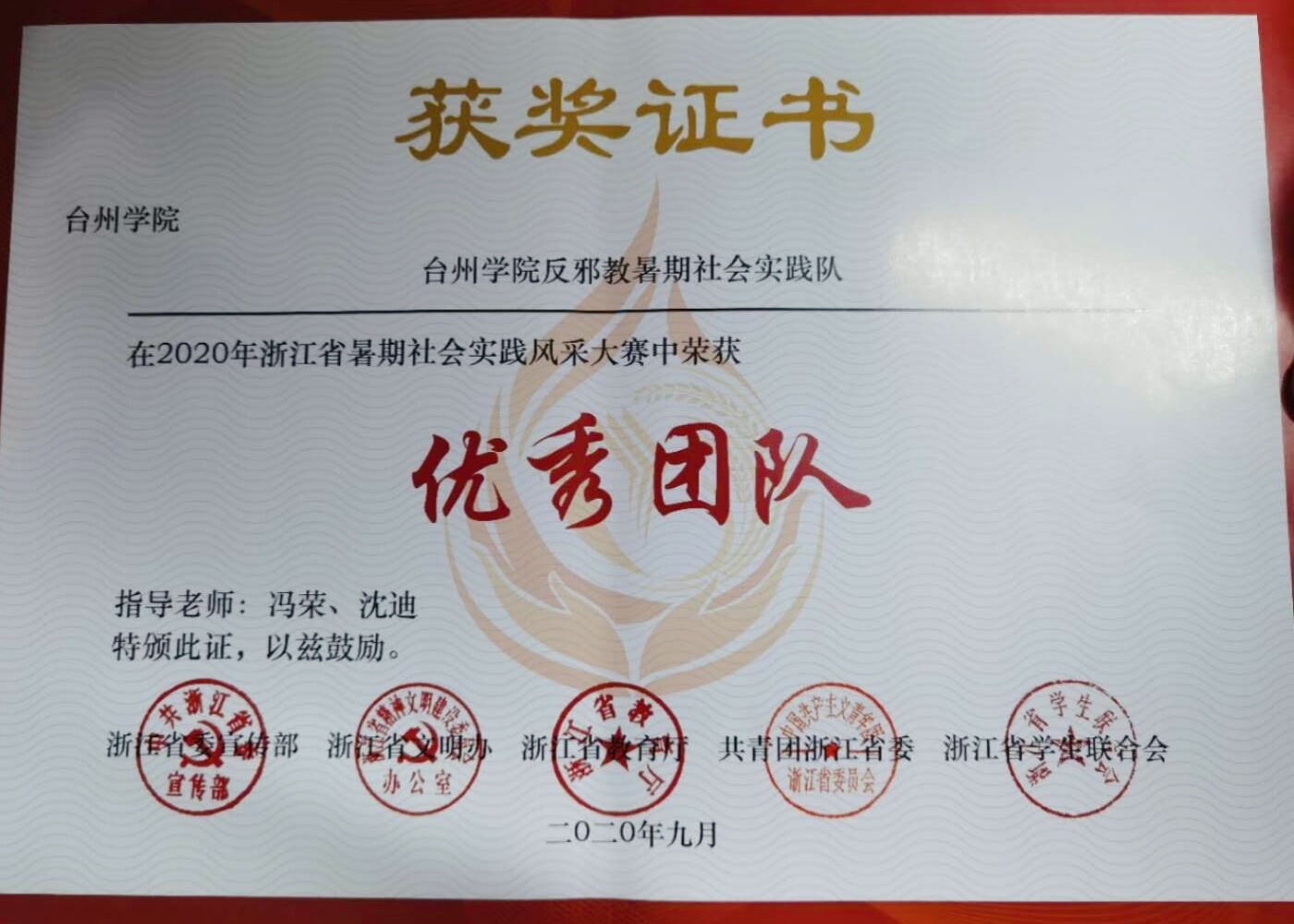 近日,省委宣传部、省文明办、省教育厅、团省委等部门公布2020年浙江省暑期社会实践风采大赛评奖结果,公司电信公司党总支副书记冯荣、辅导员沈迪指导的反邪教协会暑期社会实践队再获佳绩,荣获“优秀团队”称号。