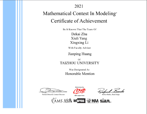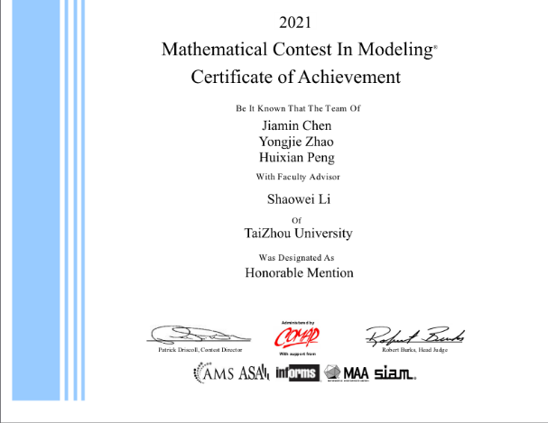 近日,2021年美国国际老员工数学建模竞赛(MCM)与交叉学科建模竞赛(ICM)公布了获奖名单,由意昂)李韶伟老师指导的陈佳敏、赵勇杰、彭慧娴一组同学和黄建平老师指导的朱德凯、杨秀丽、李星星一组同学都获得了Honorable Mention奖,这是继去年公司收获一组Honorable Mention奖之后的又一次突破。