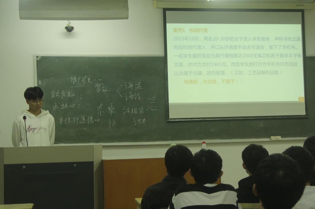 网络安全教育主题班会上,班委围绕网络诈骗主题,向同学们介绍四大网络陷阱、校园贷的情况,提醒同学们谨慎使用网络。由八个实际案例出发,向同学们展示潜藏身边的网络诈骗、对应的防范措施。最后,班委总结了同学们在面对网络诈骗时,可采取的三大防范措施以及相关防范细节。