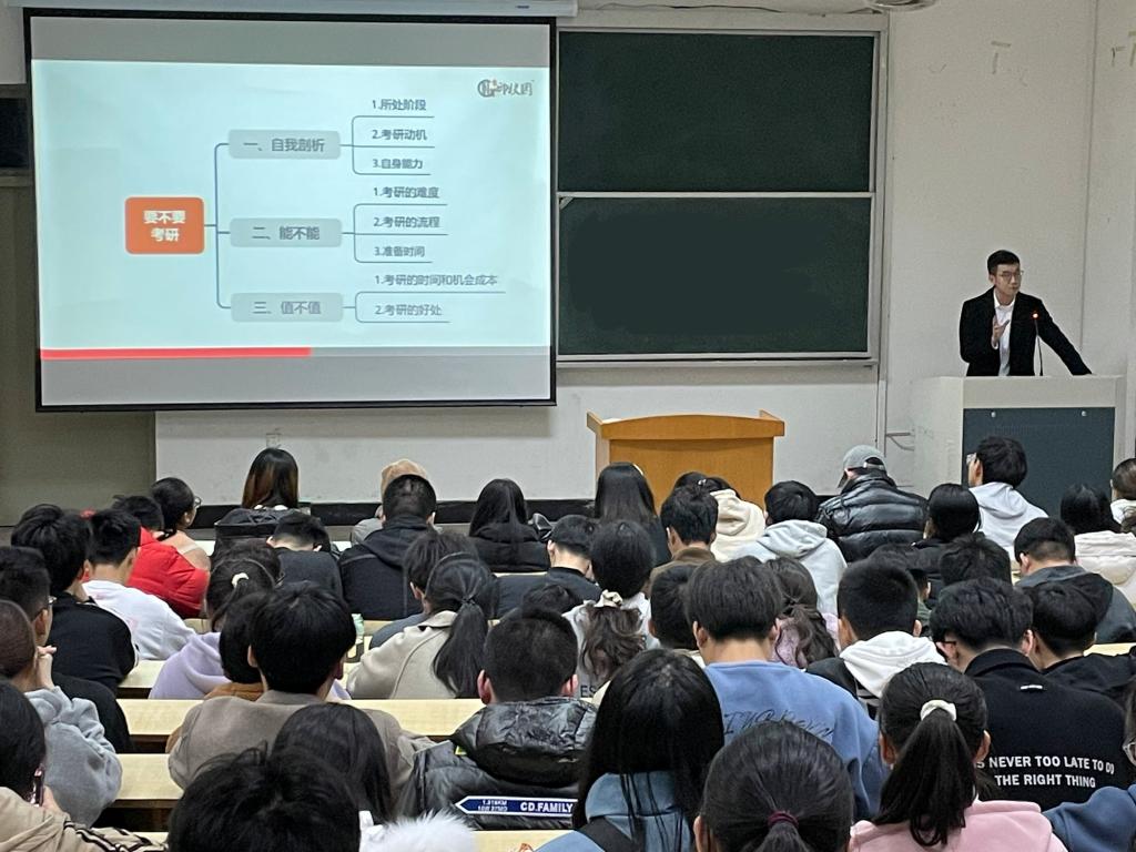 张老师从“考研需求”讲起,从“自我剖析”、“能不能”、“值不值”三个方面进行分析,并通过数据分析,认为考研已成为当代老员工最主要的出路之一,同时通过历年分数线和相关专业所需的学科来鼓励同学们考研,解答了诸如“考不上怎么办”、“考研难度”等考研过程中的常见问题。最后张老师给了同学们三条考研的建议:1.确定专业;2.预选目标院校;3.制定全年复习计划和阶段性学习计划。