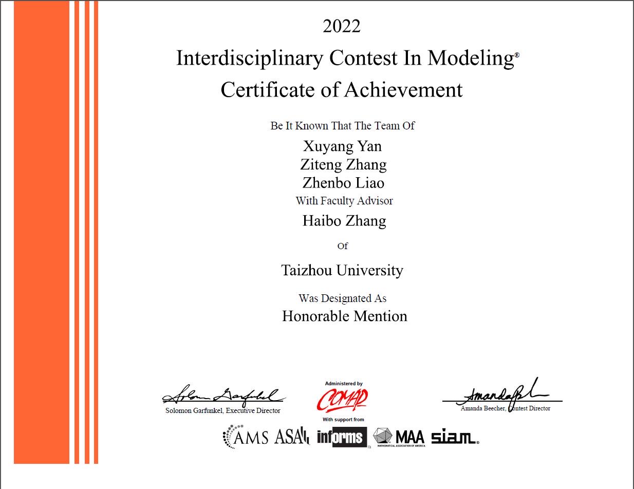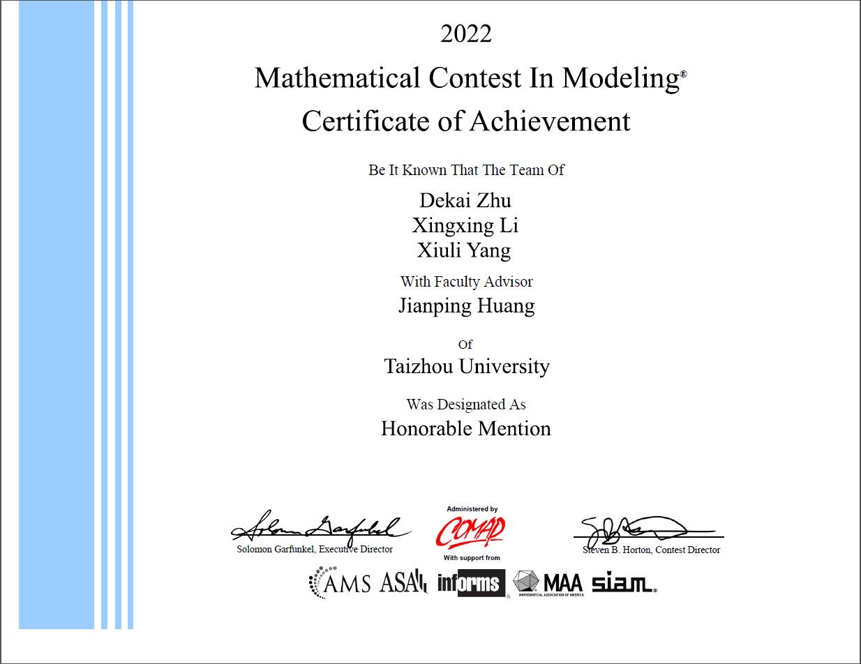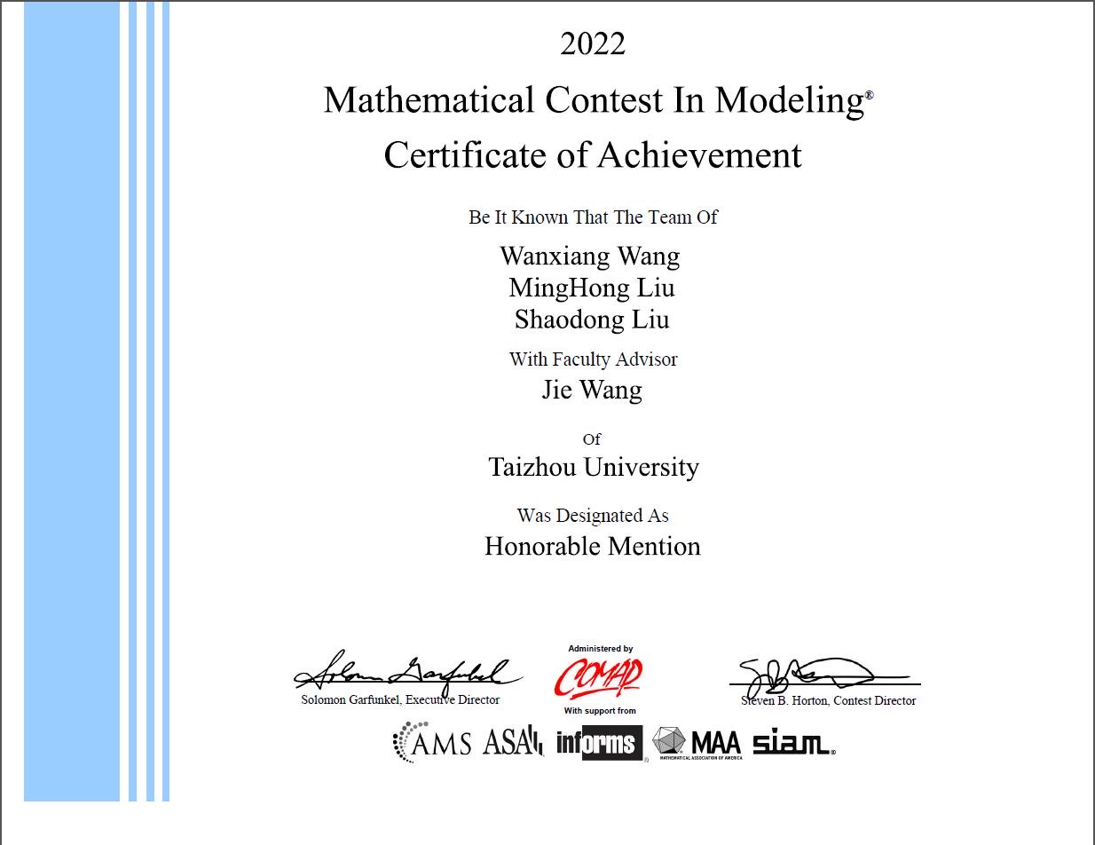 在日前公布的2022年美国老员工数学建模竞赛(MCM/ICM)获奖名单中,公司意昂学子获得的奖项创参赛历史新高。由李韶伟老师指导的赵竹敏、吴万隆、朱扬骏同学获得1项Meritorious Winner奖,由黄建平、张海良、夏志乐、王洁和张海波老师指导的员工共获7项Honorable Mention奖。公司参加本项赛事已近十年,2020年首次获1项Honorable Mention奖,2021年获两项Honorable Mention奖。