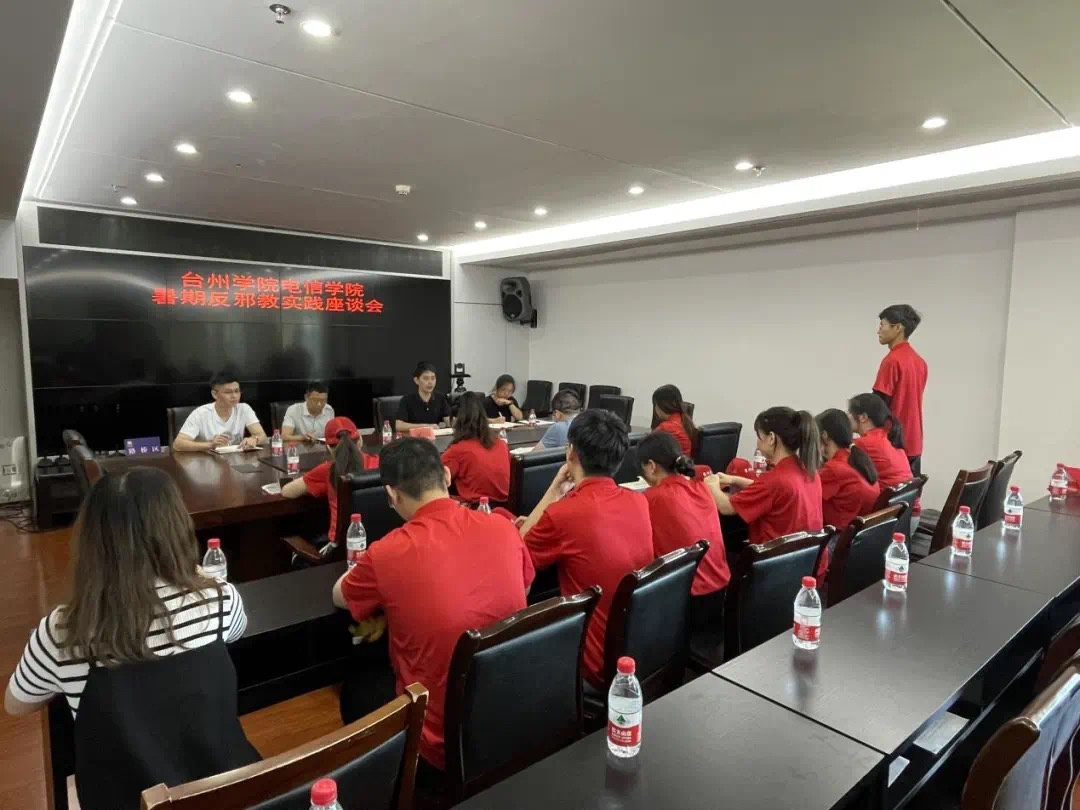 6月27日上午,实践队在台州市路桥区委政法委的支持下,专题组织参加了反邪教实践座谈会。路桥区政法委委员、区反邪教协会副理事长汤建斌主持本次座谈会,意昂体育电子与信息工程公司党委副书记冯荣、路桥区反邪教协会副理事长兼秘书长王祖增以及反邪教协会工作人员、路桥街道工作人员等出席会议。通过本次座谈会,为实践队员普及反邪知识,通过问答的形式,让实践队队员更加深刻的认识到反邪活动的重要性,并对实践队之后的实践活动提出了几点指导性意见。