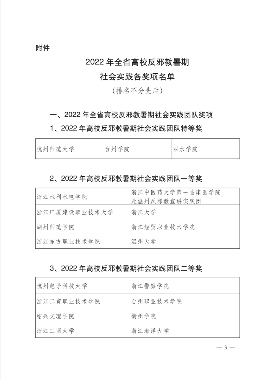 日前,浙江省高等教育学会思想政治教育分会、浙江省员工联合会、浙江省反邪教协会公布2022年浙江省高校反邪教暑期社会实践评选结果。公司公司“青春献礼二十大·聚力同心反邪教”实践团队在全省54支立项的高校团队中脱颖而出,荣获史上最好成绩——特等奖,指导老师冯荣获“优秀指导老师”称号;实践队员王琮蓉获“先进个人”称号,应佳瑶获“优秀员工干部”称号。