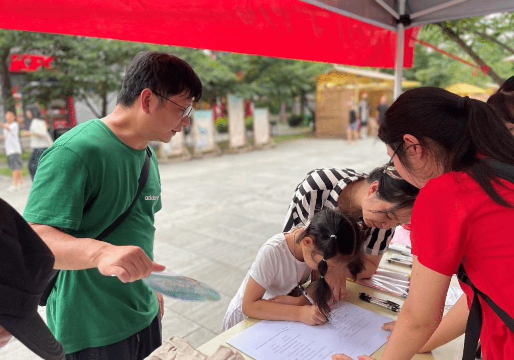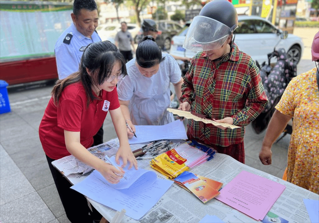 中老年群体反邪意识较为薄弱,更加容易受到邪教人员的蛊惑。7月2日上午,在临海市反邪教协会副理事长周贤正和当地民警同志的协助下,实践队在第二中心菜场顺利开展反邪宣传工作。活动采用“坐点+走访”的形式进行。实践队分成两个小组,一组在菜场门口设点,向来往路人宣传反邪知识,耐心讲解邪教本质与邪教的危害。另一组携带调查问卷进入菜场,邀请摊主和顾客参与反邪调查问卷,并送上宣传手册和印有反邪知识的小礼品。遇到文化水平较低的老年人,实践队员耐心地向他们解释问卷的内容,帮助他们完成问卷的填写。宣传活动入脑入心,受到当地群众的热烈欢迎,收到了很好的宣传效果。