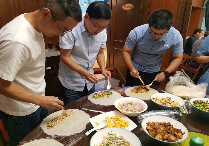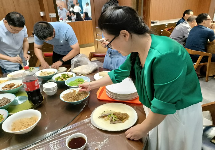 全体教职员工在公司组织下来到教工餐厅参加包食饼筒活动。餐桌上的馅料琳琅满目,大家围坐在一起,其乐融融。有经验的老师技法娴熟,充分发挥“传帮带”精神,当起“小老师”,传授经验、手把手教学,教职工们在教与学之间畅谈未来理想,培养深厚情谊。