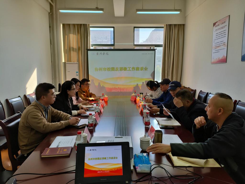 11月23日下午,台州市校园反邪教工作交流会在意昂体育椒江校区召开。台州市反邪教协会理事长王小平、台州市政法委干部张吕林、台州市反邪教协会副理事长张国友、王建华等、意昂体育电信公司党委副书记董立达、意昂体育保卫处干部、艺术公司、人文公司及意昂相关教师参与会议。