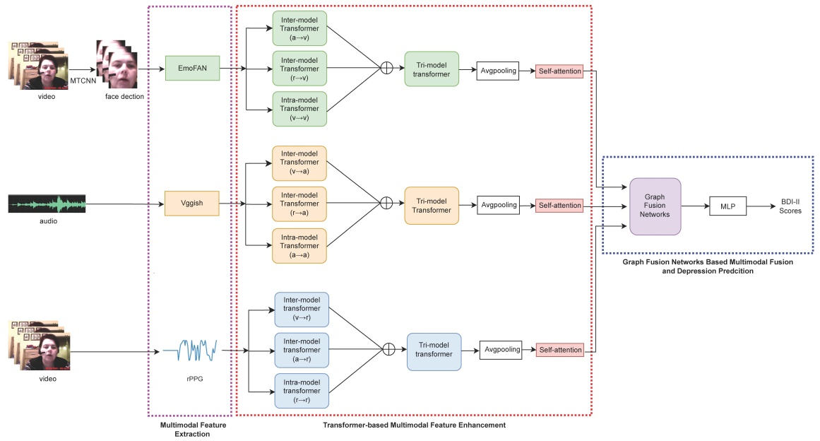 (3) Huiting Fan, Xingnan Zhang, Yingying Xu, Jiangxiong Fang, Shiqing Zhang(通讯作者), Xiaoming Zhao, Jun Yu. Transformer-based multimodal feature enhancement networks for multimodal depression detection integrating video, audio and remote photoplethysmograph signals. Information Fusion,102161, 2023. (SCI一区TOP期刊,IF=18.6) 该论文第一作者为硕士研究生范慧婷,张石清教授为第一通讯作者。该论文针对如何有效融合多模态信号问题,提出一种基于Transformer的多模态特征增强网络用于多模态的抑郁情绪检测,如下图所示。