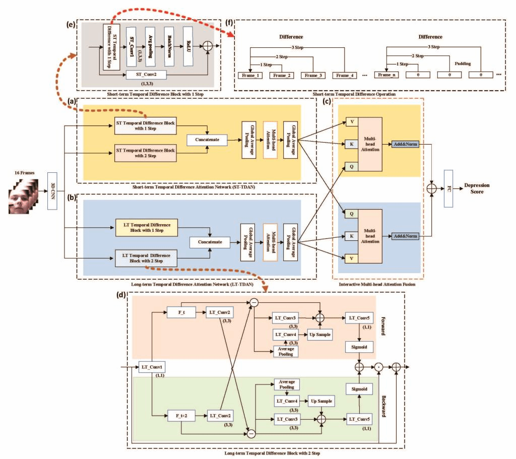 (2) Shiqing Zhang, et al., MTDAN: A Lightweight Multi-scale Temporal Difference Attention Networks for Automated Video Depression Detection, IEEE Transactions on Affective Computing, Doi: 10.1109/TAFFC.2023.3312263, 2023. (中科院二区,IF=11.2)该论文针对深度学习网络一般具有较大的计算复杂度问题,提出一种轻量级的多尺度时间差分注意力网络用于视频抑郁情绪的自动检测,如下图所示。