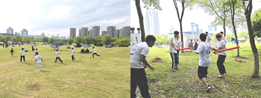 在班主任和班委带领下,同学们合作扎好帐篷,紧接着开启班级团建活动:打UNO牌、蒙眼互打、移花接木小游戏等,在老同学的热情邀请下,新同学也不再拘束,大家一同玩游戏、吃零食、畅谈未来。午餐后,师生在柔软的草地上踢起了足球,大家肆意奔跑着、嬉戏着,共同享受这美好的时光。