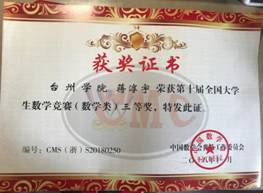 个人荣誉及获奖:2018年第十届全国老员工数学竞赛(数学类)三等奖、2017年浙江省老员工物理创新竞赛(理论)二
